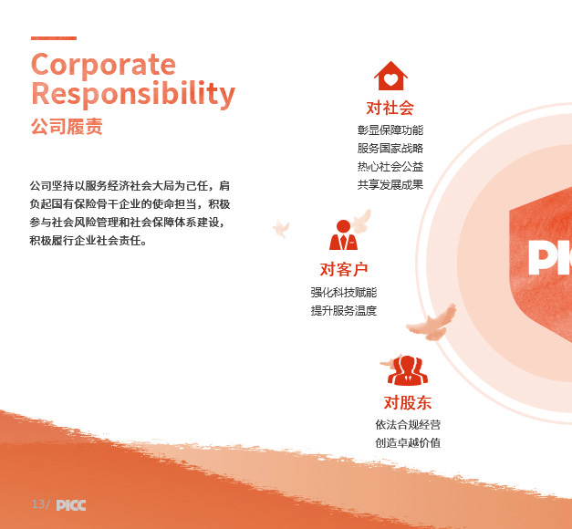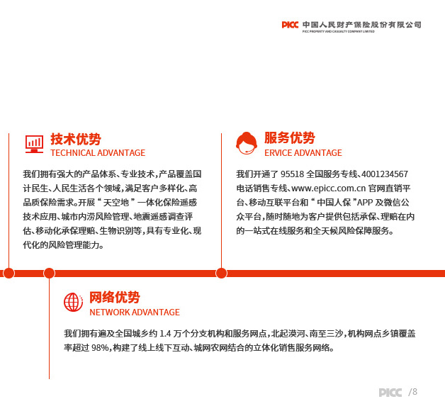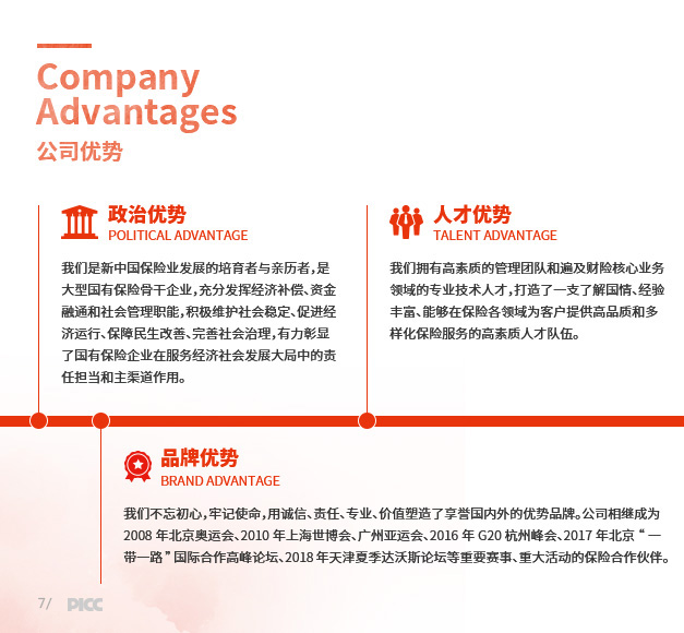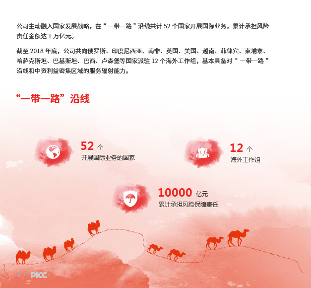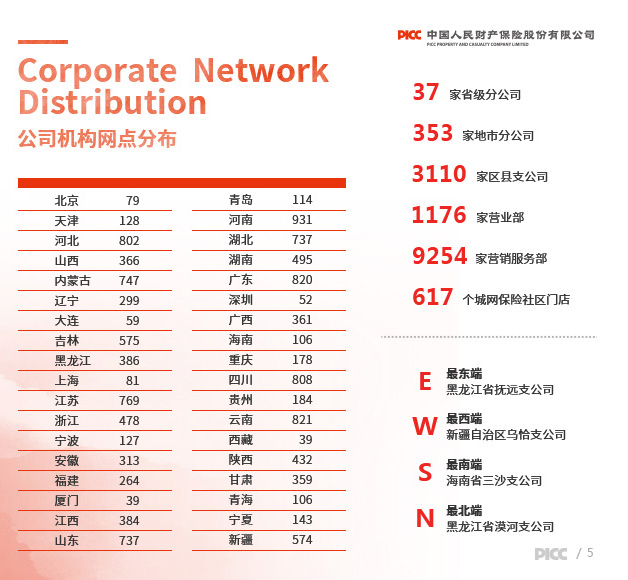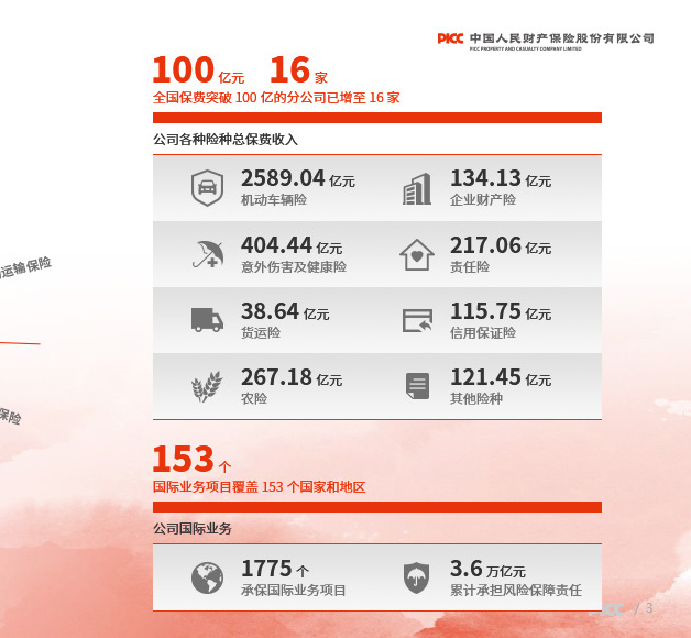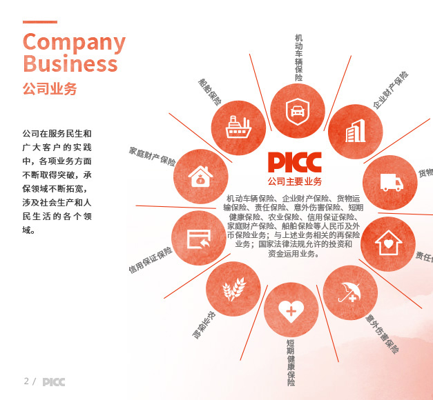 财产损失保险、责任保险、信用保险、意外伤害保险、短期健康保险、保证保险等人民币或外币保险业务;与上述业务相关的再保险业务;各类财产保险、意外伤害保险、短期健康保险及其再保险的服务与咨询业务;代理保险机构办理有关业务;国家法律法规允许的投资和资金运用业务;国家法律法规规定的或国家保险监管机构批准的其他业务。公司机构网点和国内业务基本遍布全国所有城乡地域。公司中国海外利益业务覆盖143个国家和地区。