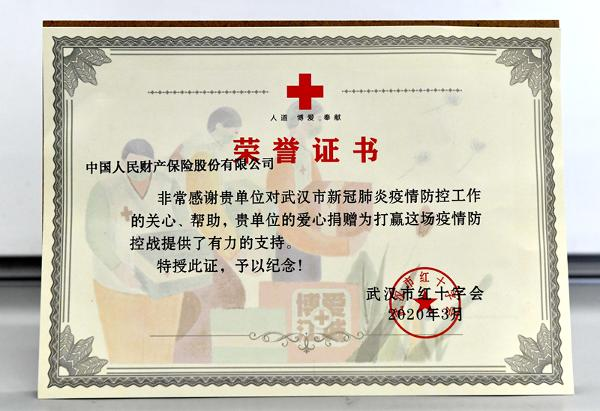 2020年3月,武汉红十字会向公司寄来荣誉证书,感谢公司对武汉市新冠肺炎疫情防控工作的关心、帮助。疫情发生后,公司第一时间向武汉红十字会捐款1000万元,同时捐赠保险,向所有参与武汉疫情防控和医务人员及家属提供相应保险保障。此后,公司先后向北京、山东等25个省(直辖市、计划单列市)疫情防控相关单位和个人捐赠保险,保额达50多亿元。