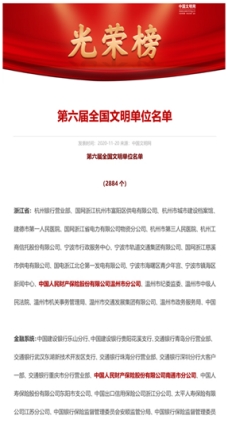 2020年11月20日,中央文明委发布《关于表彰第六届全国文明城市、文明村镇、文明单位和第二届全国文明家庭、文明校园及新一届全国未成年人思想道德建设工作先进的决定》,江苏南通市分公司、浙江温州市分公司获“第六届全国文明单位”荣誉称号。公司获奖数量居行业之首。
