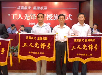 6月12日,中国金融工会代表中华全国总工会向在“5.12”抗震理赔中做出杰出贡献的人保财险四川省绵阳市北川支公司授予抗震救灾重建家园“工人先锋号”旗帜。于5月17日临危授命的北川公司主持工作的副经理王凤斌代表公司员工表示,要在党中央、国务院、地方党政和上级公司的领导下,把公司建设好,进一步做好抗灾理赔工作,充分发挥中国人保在大灾理赔中的先锋模范作用,为北川灾区恢复重建做出新的贡献。