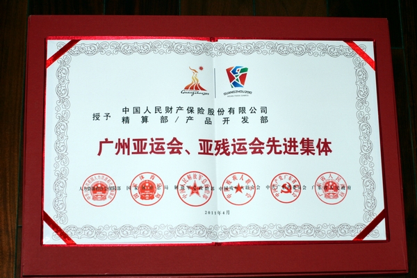 2011年5月6日,中共中央、国务院在广州中山人民纪念堂隆重举行广州亚运会、亚残运会总结表彰大会。人保财险精算部/产品开发部作为中国人保服务广州亚运会、亚残运会的代表,被人力资源和社会保障部、国家体育总局、解放军总政治部、中国残疾人联合会、中共广东省委、广东省人民政府联合授予“广州亚运会、亚残运会先进集体”荣誉称号。