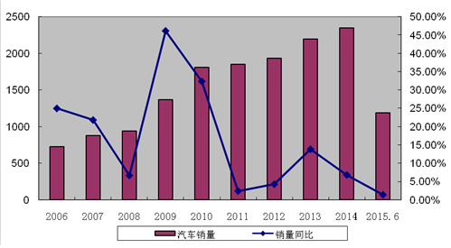 一是汽车销售持续低迷。根据中国汽车工业协会统计,2015年上半年,全国汽车产销分别为1209.5万辆和1185.03万辆,同比增长2.64%和1.43%,同比增幅均下降7个百分点,新车销量增速也是近10年的最低增速。