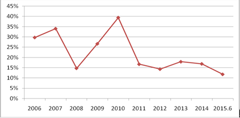 1、市场增速回落明显。截至2015年6月,全行业实现车险保费收入2995.56亿元,同比增长11.75%,较2014年下降5.09个百分点,增速下降较为明显,为近10年的最低增速。