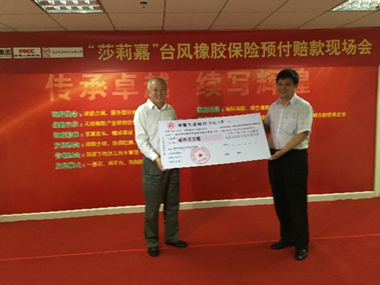 11月9日,“莎莉嘉”台风橡胶树风灾保险预付赔款仪式在海胶集团举行。在预付赔款仪式上,人保财险副总裁王德地将“莎莉嘉”台风橡胶树风灾保险预付赔款2000万元支票交到海南农垦控股集团副董事长、 海胶股份有限公司总裁刘大卫手中。此笔预付赔款是“莎莉嘉”台风农险赔案中最大的一宗单笔预付赔款,有效解决了海胶集团的燃眉之急。