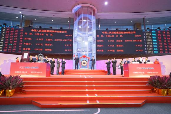 2018年11月16日上午9:30,随着上海证券交易所鸣锣开市,中国人民保险集团股份有限公司(股票简称“中国人保”股票代码:601319)正式登陆A股市场,成为国内第五家A+H股两地上市的金融保险企业,标志着中国人保自2012年港股上市以来,开启资本市场新征程。中国人保A股公开交易首日开盘4.01元,开盘后随即封住涨停,最新价为4.81元,涨幅达到44.01%。